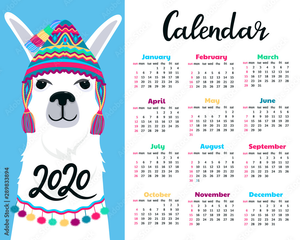 Calendar For 2020 From Sunday To Saturday Cute Llama In Funny Hat With Fluffy Pom Pom Alpaca Cartoon Character Funny Animal Stock Vector Adobe Stock